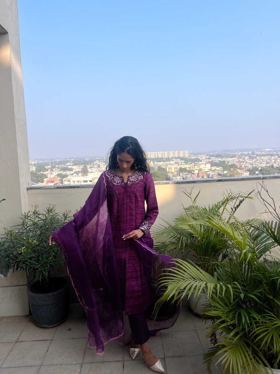 Elegant and timeless, the Inara Wine Silk & Organza Hand Embroidered Set is crafted with finesse for a look that blends classic luxury with artisanal detailing. The geecha silk shirt is adorned with delicate hand embroidery on the neckline and sleeves, paired with pure silk trousers that bring a graceful fall. Completing the look is a pure organza dupatta with fine scalping along the edges, adding lightness and refinement. The rich wine shade makes this ensemble perfect for festive occasions, weddings, and evening celebrations.